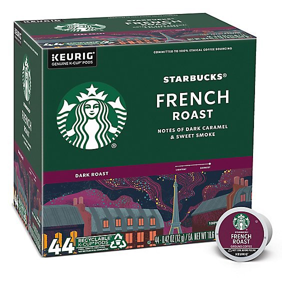 Starbucks French Roast 100% Arabica Dark Roast K Cup Coffee Pods Box 44 Count - Each is a dark roast coffee with notes of dark caramel and sweet smoke.