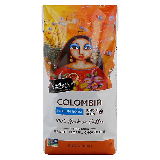 Signature SELECT Coffee Whole Bean Arabica Medium Roast Colombia - 32 Oz. is a 100% Arabica coffee that has been Non-GMO Project verified and sourced from the world's premier growing regions. Its well-balanced combination of rich chocolate flavor and bright acidity makes it an enjoyable cup of coffee. It is expertly roasted in small batches to ensure the perfect flavor and aroma, and comes with a quality & satisfaction guarantee.