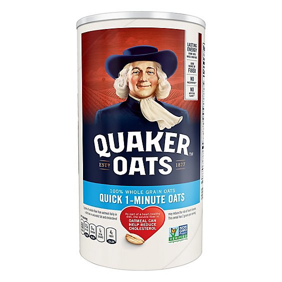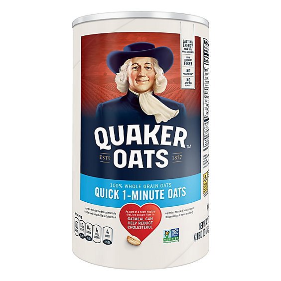 Quaker Oats Quick 1 Minute - 18 Oz is a 100% Whole Grain oat product that is certified by the American Heart Association for meeting criteria for heart-healthy food and has no preservatives, added sugars, artificial flavors or added colors. It contains 0g of trans fat per serving and provides 4g of dietary fiber per serving. It also has soluble fiber that helps reduce cholesterol when part of a diet low in saturated fat and cholesterol.
