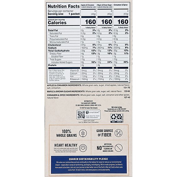 This Quaker Oatmeal Instant Flavor Variety Value Pack is a great way to get your nutrition on the go. With 18 single-serve packets of oatmeal, including 6 Apples & Cinnamon, 8 Maple & Brown Sugar, and 4 Cinnamon & Spice varieties, this value pack is a delicious and convenient way to enjoy the goodness of oats. Each packet contains no artificial preservatives or flavors and provides 160 calories per serving. Plus, each packet contains 100% whole grain oats and is a good source of fiber. Enjoy knowing you are getting Heart Healthy nutrients with every delicious bowl!