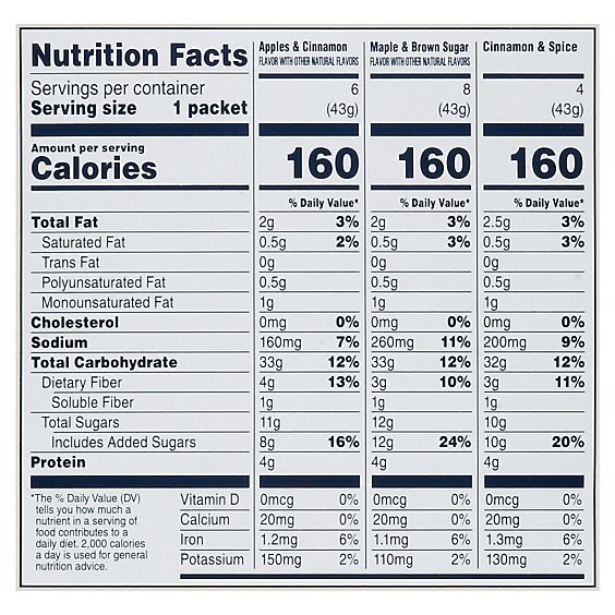 Added sugars is the line that matters on flavored oatmeal. Plain oats: zero. Quaker Maple & Brown Sugar: 12 grams. Some brands: 19. Look for 8 grams or less if you're buying flavored.