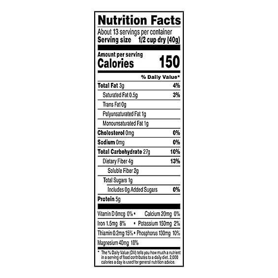 Serving size is half a cup dry (about 40 grams), making roughly one cup cooked. Some brands shrink the serving to make the sugar look better. Compare the same amount.