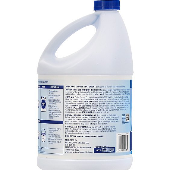 This product, Signature Select Bleach Low Splash Regular - 121 FZ, is a concentrated cleaner that deodorizes and brightens laundry. It is 100% guaranteed for quality and satisfaction or your money back.