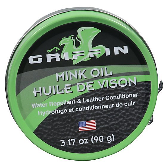 Griffin Oil Mink is a water repellent and leather conditioner with paraffin, beeswax, and mink oil. It is made in the USA and produced by Griffin Brands Inc. Directions for use are provided and it may darken some leathers so spot testing is recommended before full application. Regular use provides the best results and it should be stored in a cool area to prevent freezing.